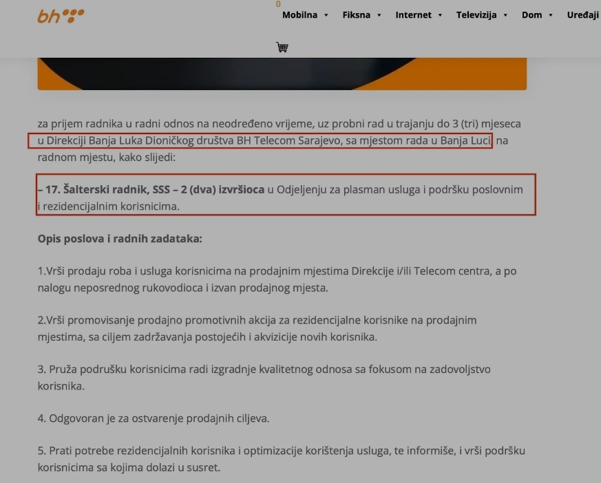 “Javni oglas za prijem radnika u radni odnos na neodređeno vrijeme, uz probni rad u trajanju do 3 (tri) mjeseca u Direkciji Banja Luka Dioničkog društva BH Telecom Sarajevo, sa mjestom rada u Banja Luci, na radnom mjestu, kako slijedi: – 17. Šalterski radnik, SSS – 2 (dva) izvršioca u Odjeljenju za plasman usluga i podršku poslovnim i rezidencijalnim korisnicima”, objavljeno je na stranici BH Telecoma 26. juna ove godine.