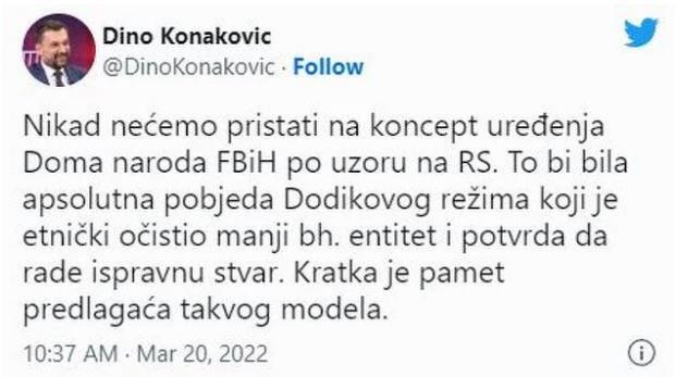 "Nikad nećemo pristati na koncept uređenja Doma naroda FBiH po uzoru na RS. To bi bila apsolutna pobjeda Dodikovog režima koji je etnički očistio manji bh. entitet i potvrda da rade ispravnu stvar. Kratka je pamet predlagača takvog modela", napisao je Konaković tog dana.