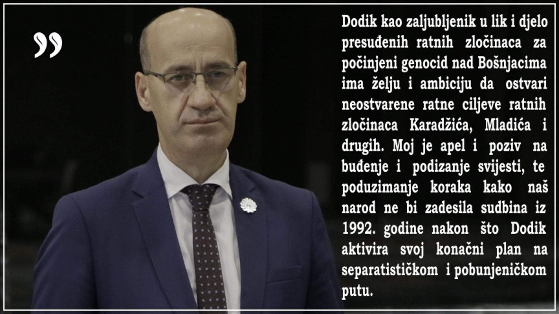 Dodik kao zaljubljenik u lik i djelo presuđenih ratnih zločinaca za počinjeni genocid nad Bošnjacima ima želju i ambiciju da ostvari neostvarene ratne ciljeve ratnih zločinaca Karadžića, Mladića i drugih.